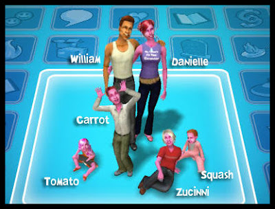 Last time Danielle and William started giving local townies much needed makeovers for free. Carrot and Zucinni grew to children and Danielle soon found out that Risky WooHoo had struck again and she was expecting. William served up some lovely cheesecake 'cause he's a family sim and this family needed a girl. Soon twins Squash (boy) and Tomato (girl) were born.